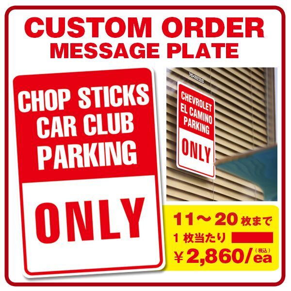 お好きな文字をいれて作成できるので、自由度の高いオリジナルのメッセージ プレートが制作可能です。ご家庭のパーキング スペース、ガレージ、ショップ オリジナル、カークラブ、MCなどご使用の目的に応じてお使いください。
