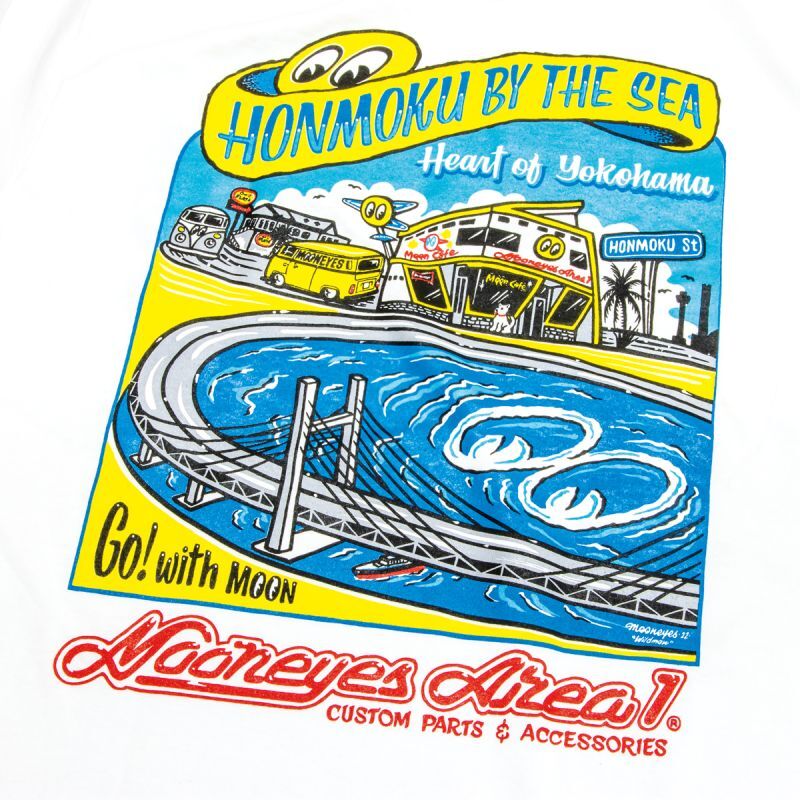 フロントの胸元には、本牧 ストリートを案内するサインボードにパームツリー、バックは本牧 横浜に所在する MOONEYES Area-1 と、MOON Cafe、そしてその傍らには、知る人ぞ知る MOONEYES Mascot Dog ロア。