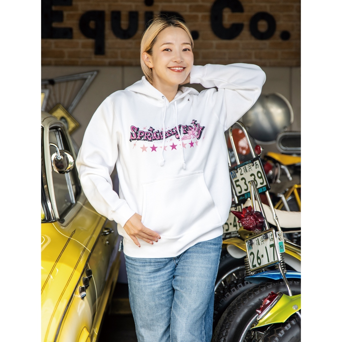 MOONEYES Imagineer emi が日本各地の Drag Race に参加する愛車の 1972 Chevrolet Vega Wagon の Sprightly Fairy がバックを大きく飾るプルオーバー フーディーです。