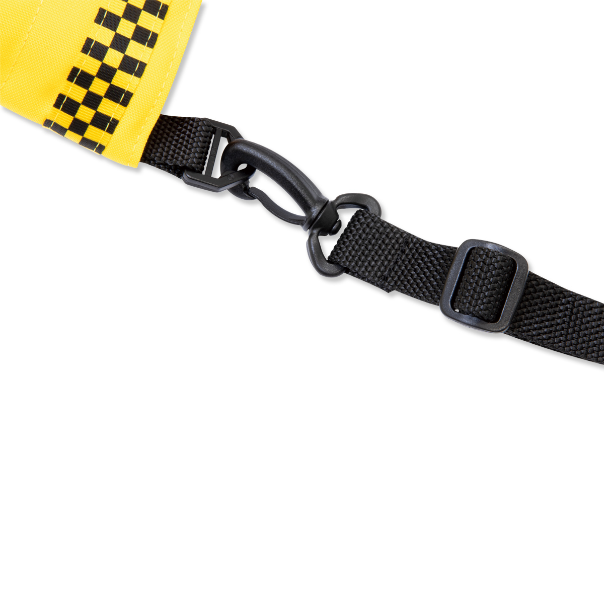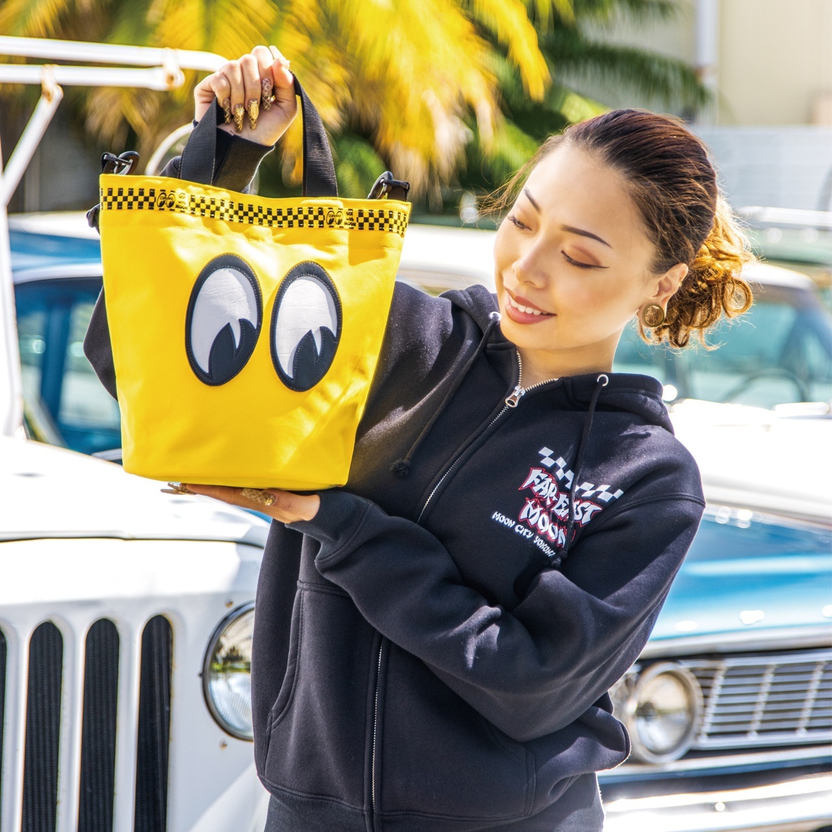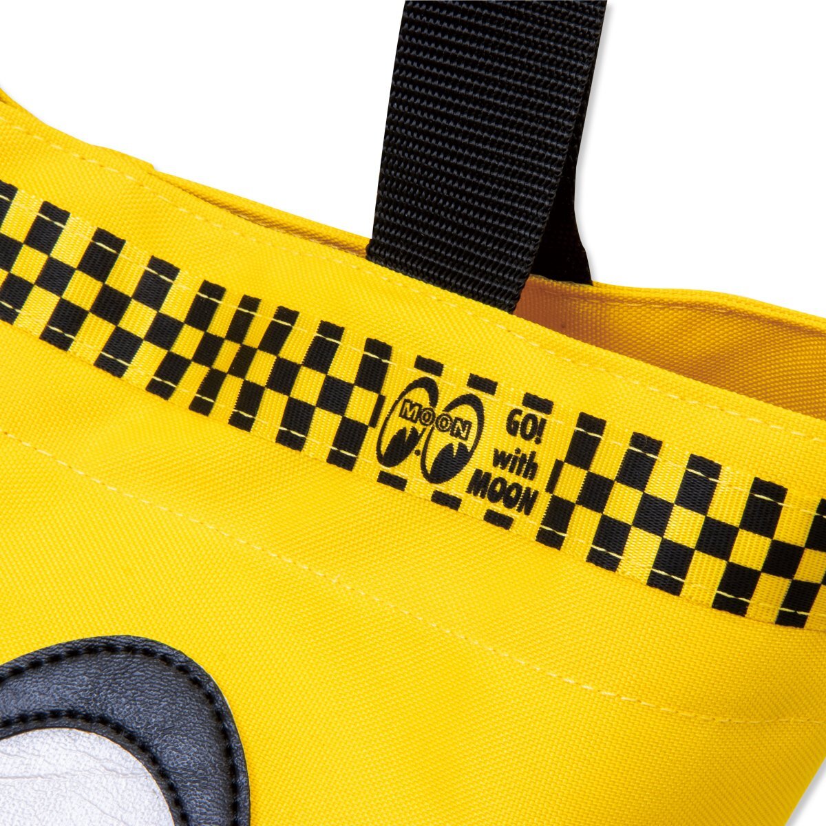 フロントの存在感のある MOON アイシェイプ パッチは、MOONEYES の創設者 Dean MOON 時代のプロダクツに使用されていたものを秘蔵品を発掘。フェイクレザー素材がクラシカルな雰囲気を演出し、さらにバッグ上部には 「GO! with MOON」ロゴ入りのブラック×イエロー チェッカー パターンをアクセントにあしらいました。