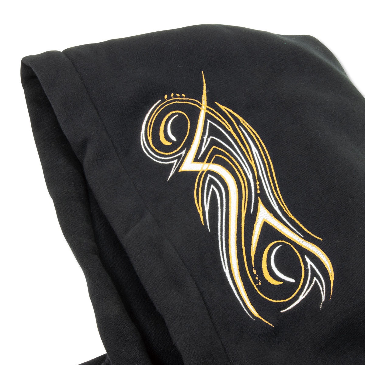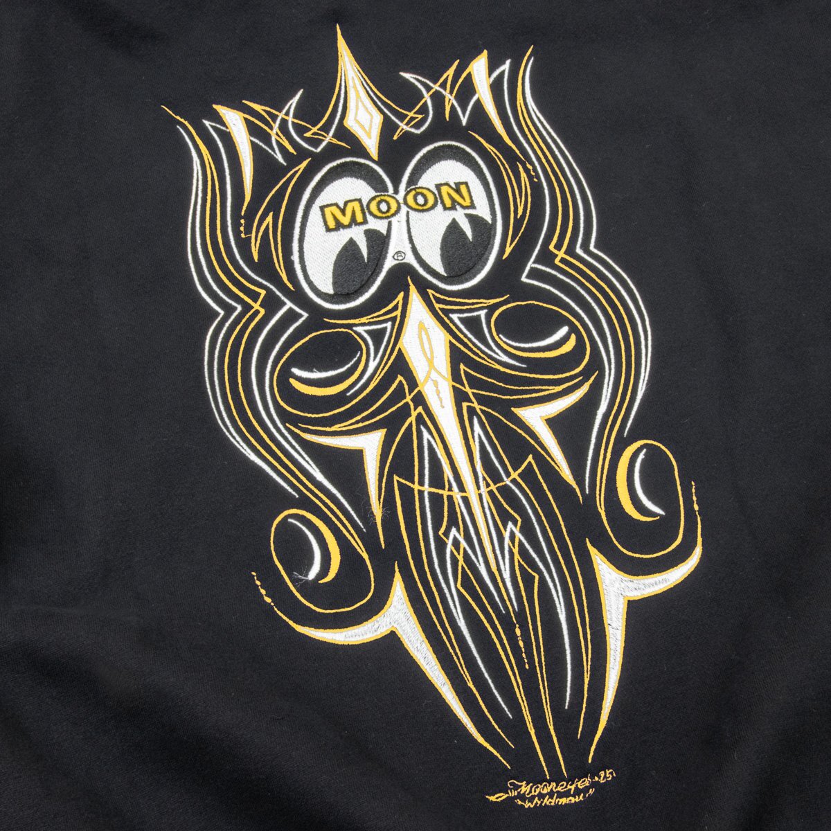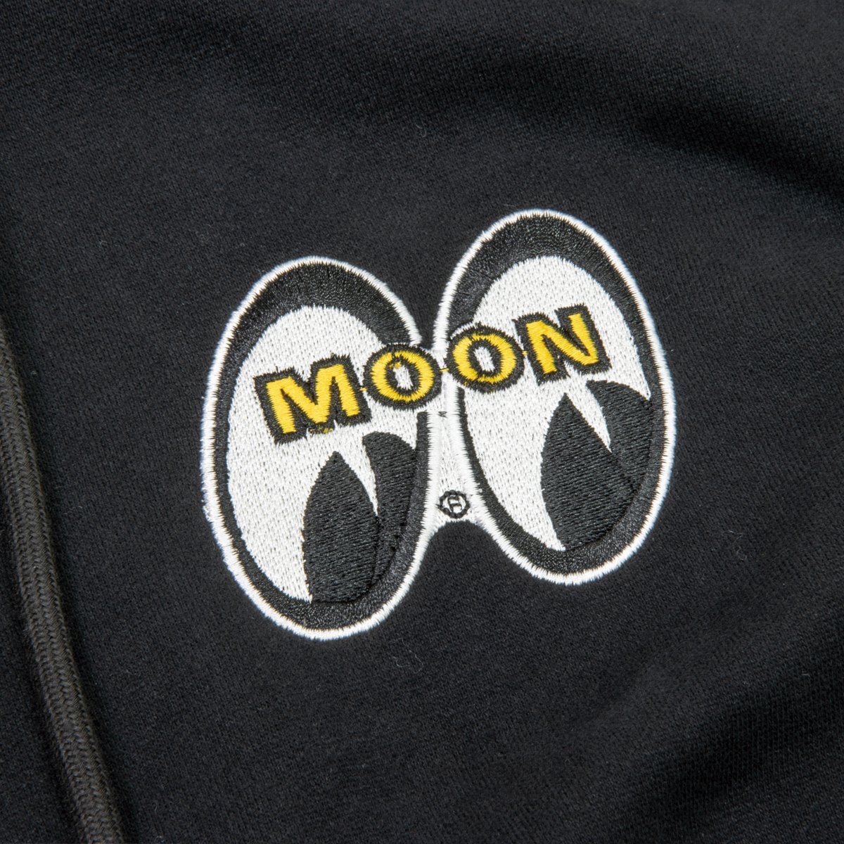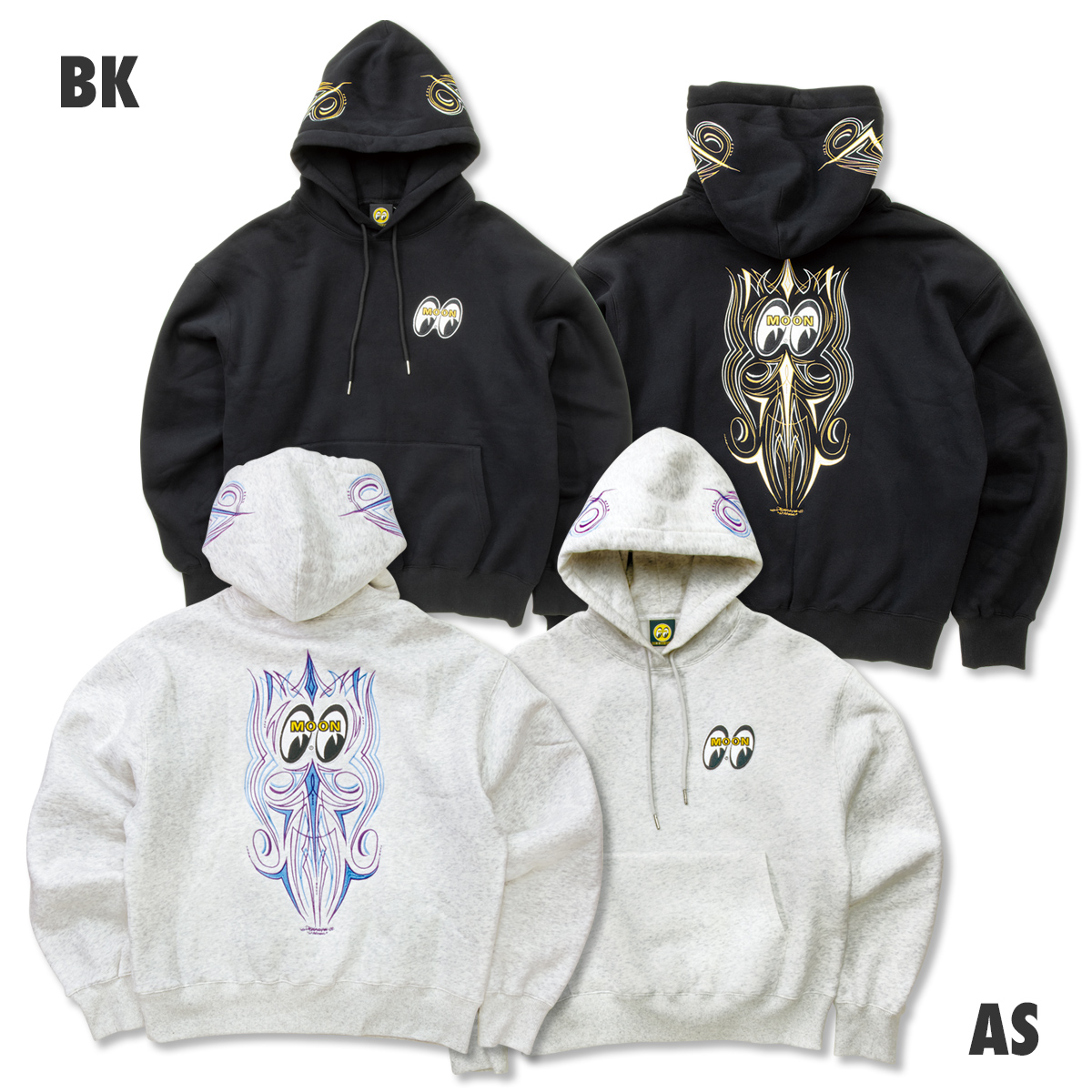 細部まで丁寧に施された刺繍によって、手描きの美しいラインが立体的に際立ちます。バックには大胆に、フードにはアクセントとしてピンストライプを配置。フロント胸元にはワンポイントで MOON アイシェイプの刺繍 が入り、さりげなく存在感を演出します。