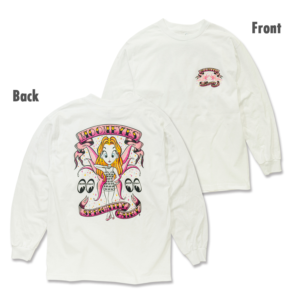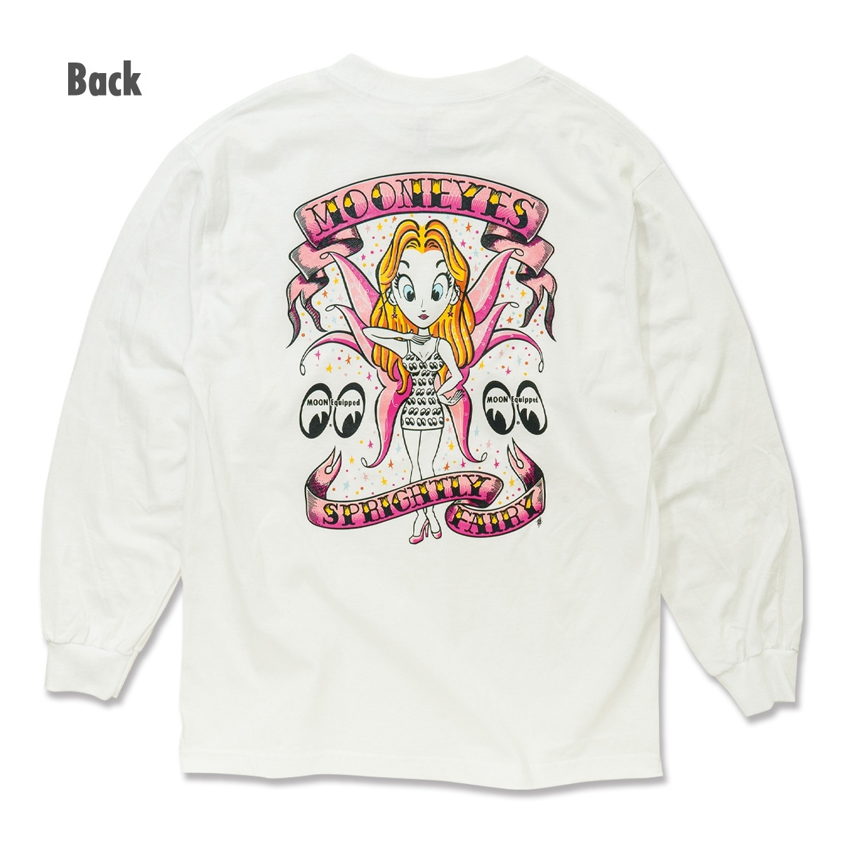 実際のショーボードを手がけた Pinstriper Sugi Sack が、MOONEYES in ACTION でお馴染みの、あのポーズのフェアリーを新たに描き起こし、そのアートワークがバックを飾ります。フロントにはワンポイントで、「SPRIGHTLY FAIRY」を象徴するアイコンが入ります。