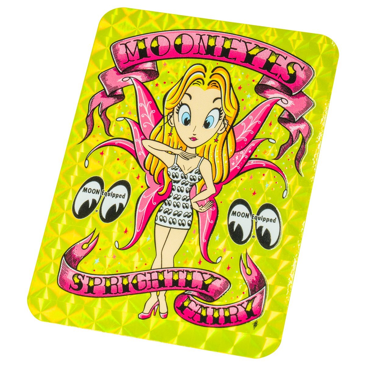 実際のショーボードを手がけた Pinstriper Sugi Sack が、MOONEYES in ACTION でお馴染みの、あのポーズのフェアリーを新たに描き起こし、スマートフォンケースなどに入れたりするのにもちょうどいいサイズ感のステッカーです。