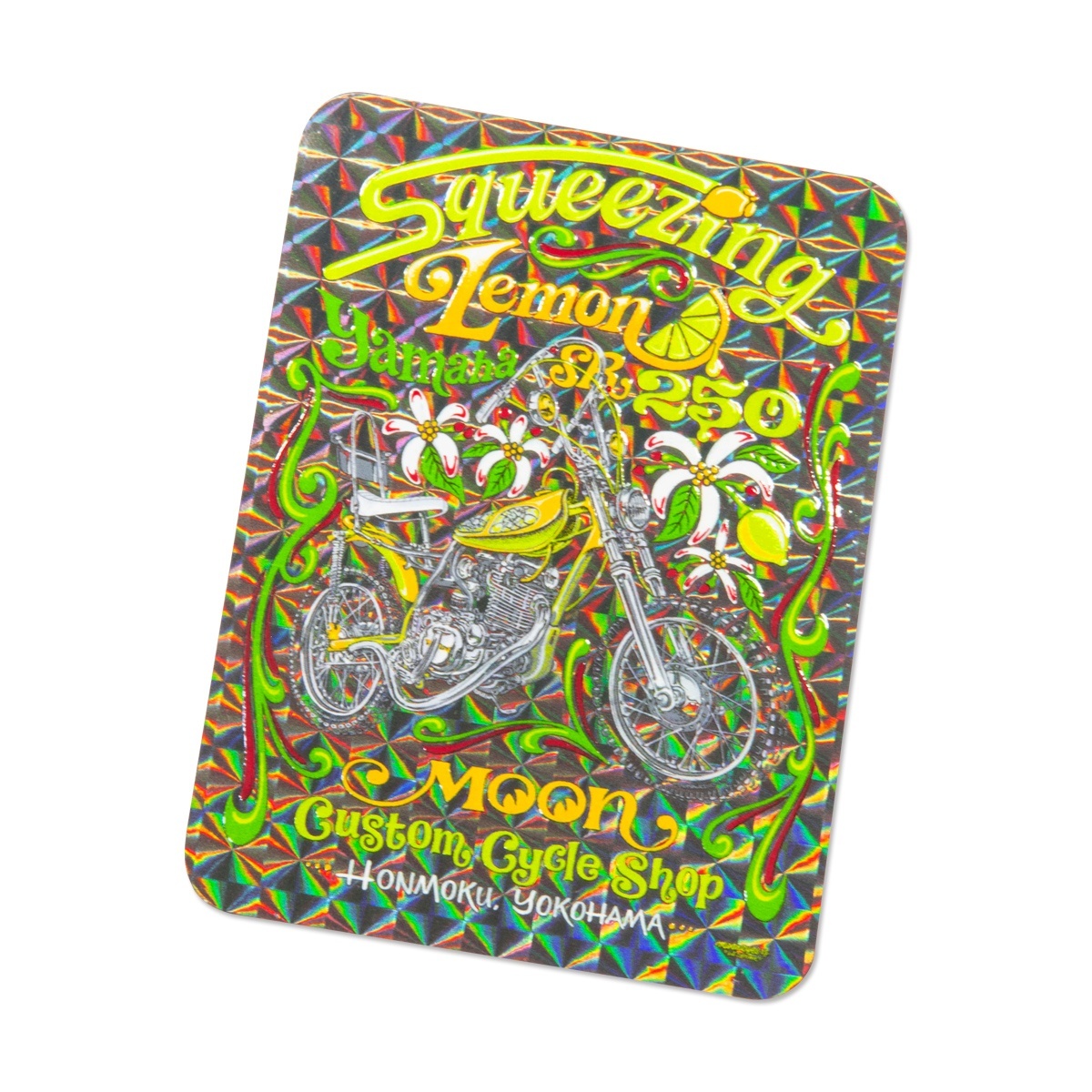 MOON Custom Cycle Shop (MCCS) ブランドから登場した Yamaha SR 250 "Squeezing Lemon" をフィーチャーしたプリズム ステッカー。