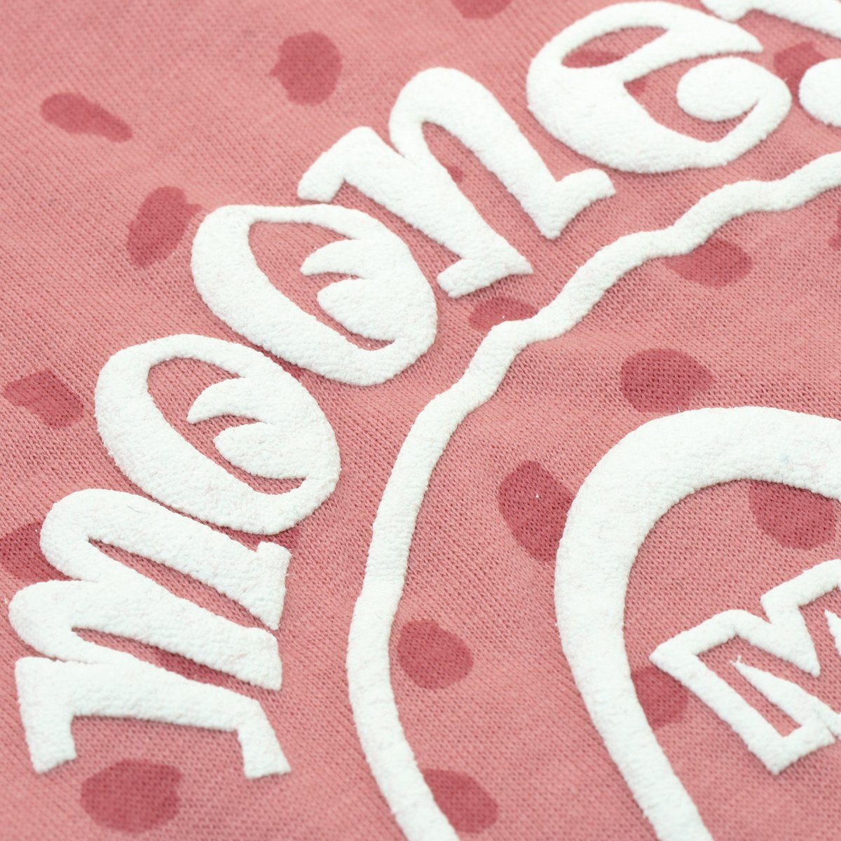 もこもこの発泡プリントで、フロントとバックに大きく MOON アイボールロゴ が入ったロングスリーブのベビー ロンパースです。