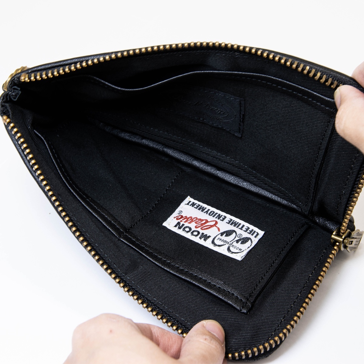お札などを余裕をもって収納できる広々としたメインスペースを備え、フロント右下には MOON Equipped の刻印が施されたレザーラベルを配置しています。 内側にはカードホルダーとして使えるスモールポケットを2つ設け、それぞれに MOON Classic のブランドネームをあしらいました。 また、向かい側にはラージポケットを1つ備え、BACKDROP Leathers のブランドネームが入ります。