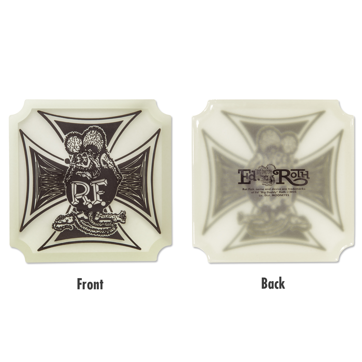 Iron Cross と Rat Fink がデザインされた、グロウ イン ダークのラバートレイです。ちょっとした小物入れとしてぴったりのサイズ感。