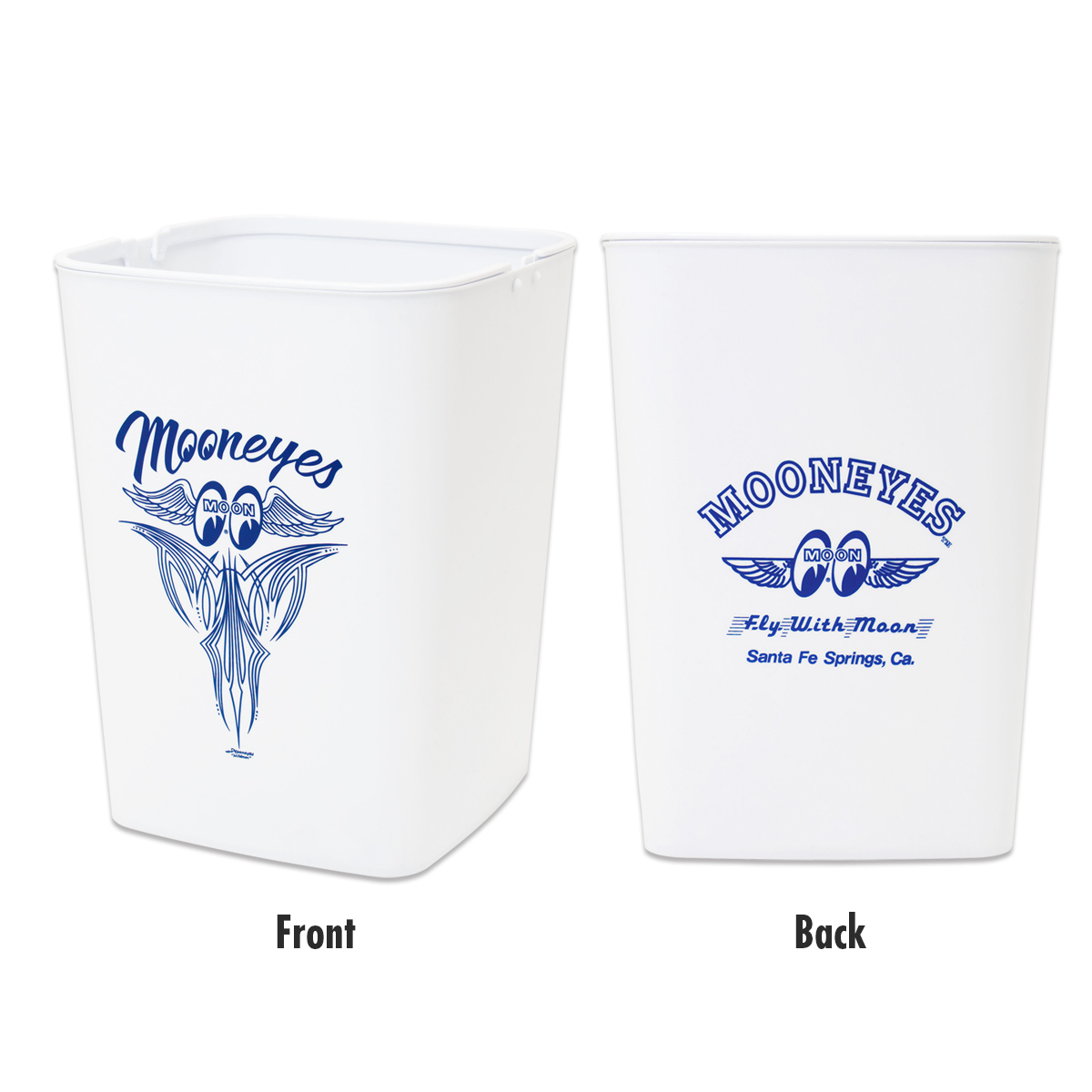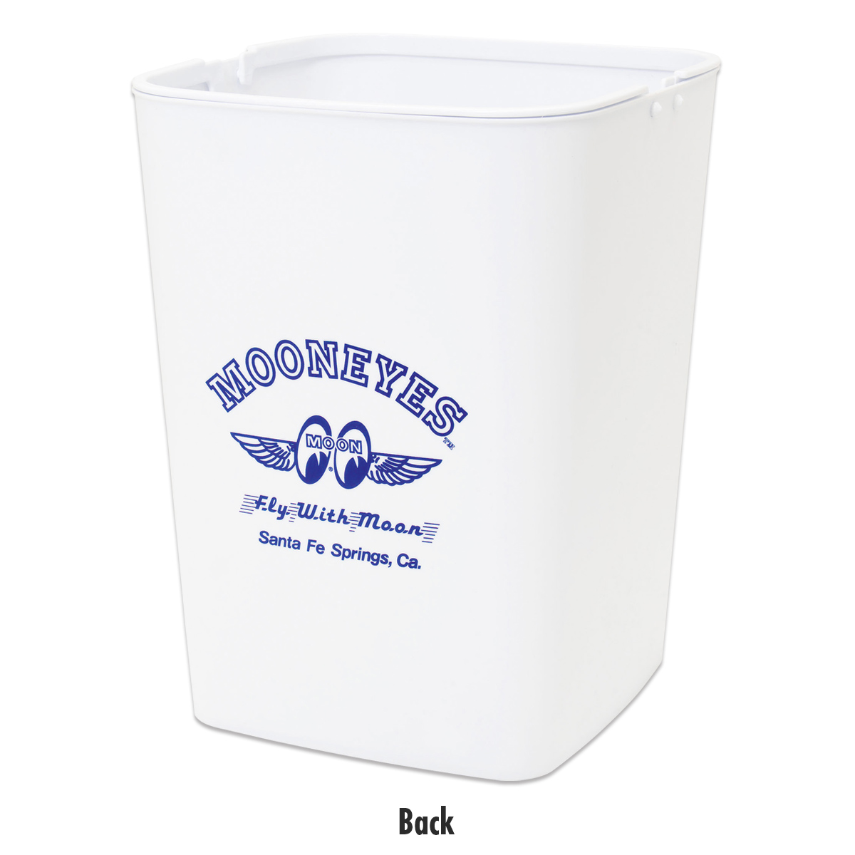 ハンドルが付いたコンパクト サイズのバケツや収納ボックスにもなるクリーンなホワイトカラーに MOONEYES の長い歴史の中で、今なお人気のお馴染み Fly With MOON ロゴをデザインしたゴミ箱です。