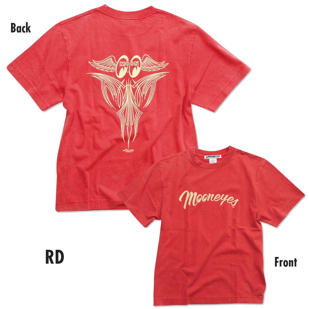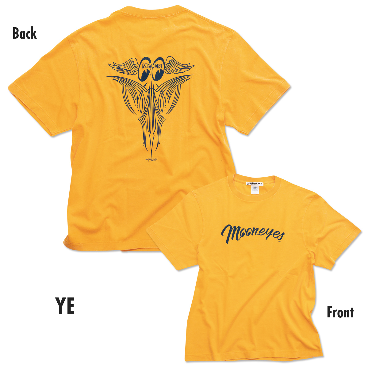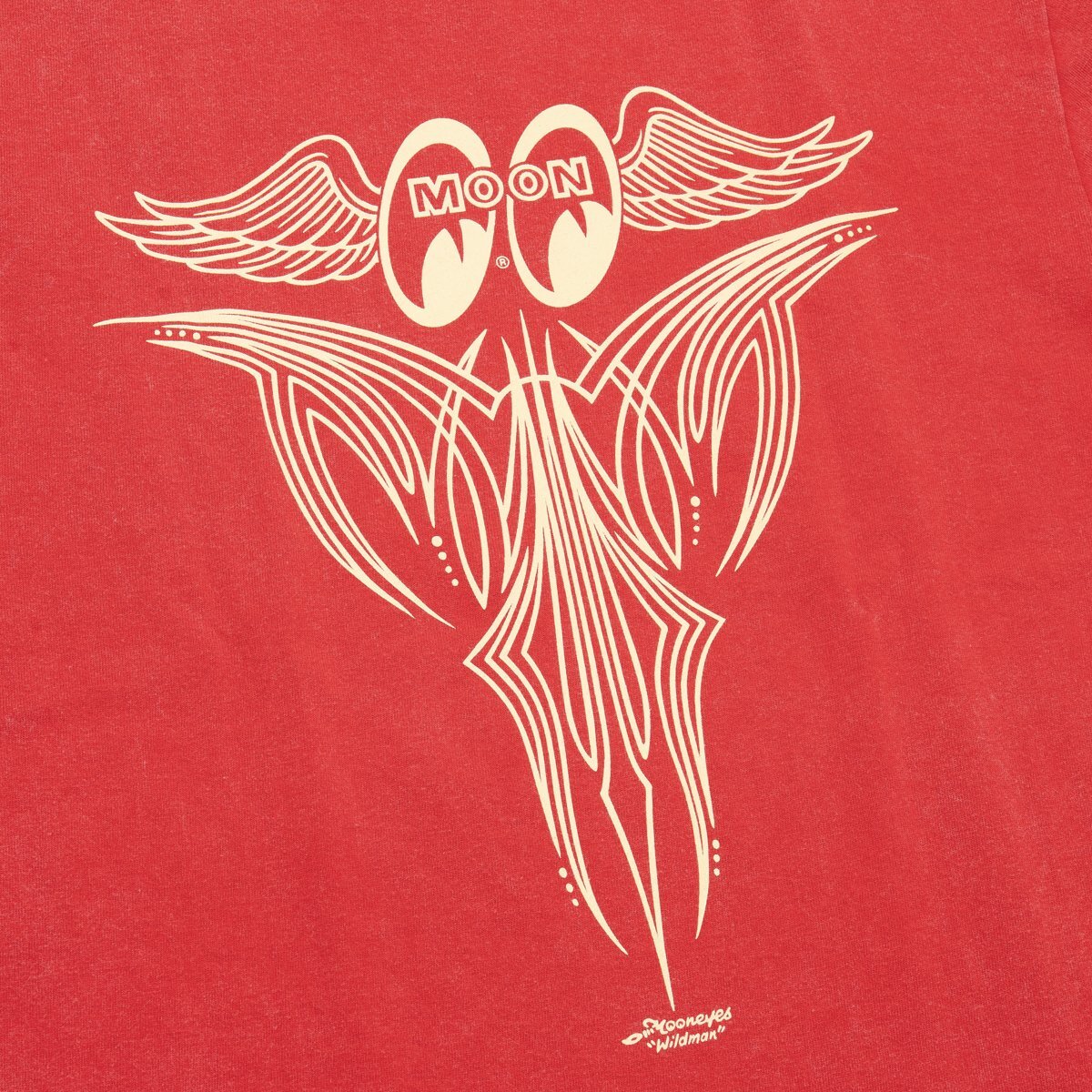 Wildman 石井による、ウィングの羽ばたきをイメージしたピンストライプとロゴがバックをクールに飾ります。フロントは、MOONEYESの文字が胸元を横切るように入る存在感のある仕上がり。