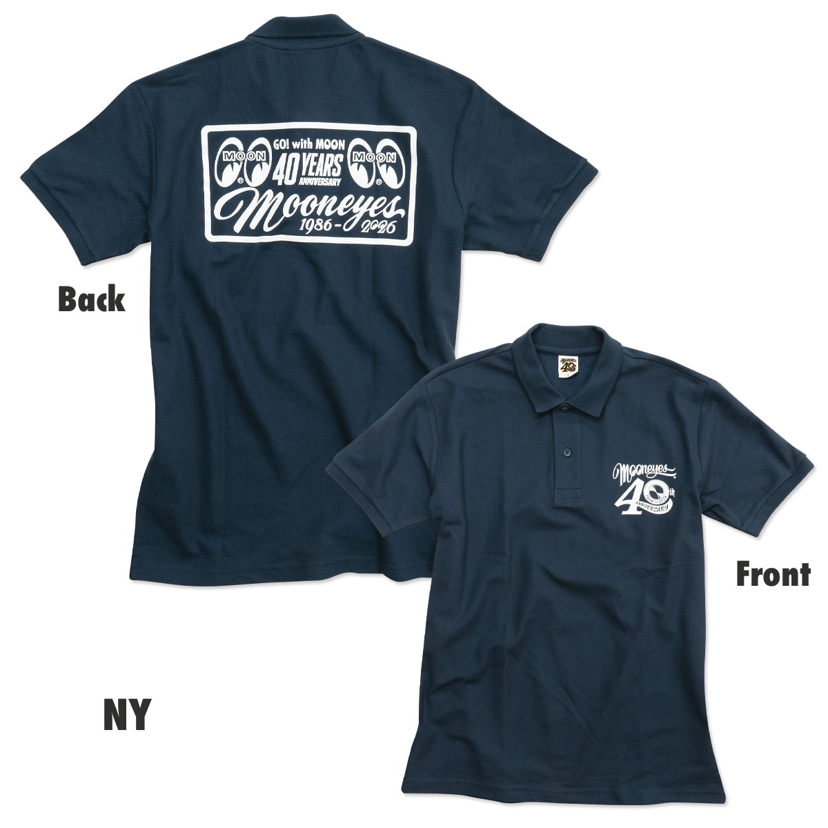 左右に MOON アイシェイプ・ロゴを配し、40 YEARS ANNIVERSARY のレタリングをグラフィカルに表現した、クラシックな魅力溢れる40周年記念ポロシャツです。